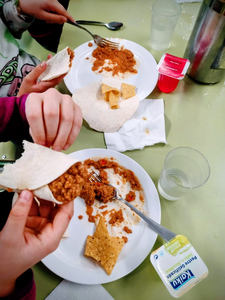 Dentro de las actividades organizadas en el comedor escolar, hoy hemos tenido una jornada gastronómica mexicana. El menú ha consistido en frijoles al estilo mexicano, chili con carne y pico de gallo, gelatina de fresa o macedonia, totopos y tortitas de trigo. Durante las semanas anteriores ha habido diferentes talleres y los alumnos y alumnas que han querido, han realizado adornos para decorar el comedor. En las fotos podéis ver algunas imágenes de los talleres y del menú servido hoy.
